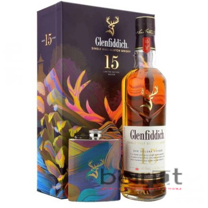 The “GLENFIDDICH 15 Y + FLASK” refers to a limited edition gift set that includes a 700ml bottle of Glenfiddich 15 Year Old Single Malt Scotch Whisky and a co-branded hip flask. This set features unique, often artist-designed packaging and is a popular gift option for whisky enthusiasts. The whisky inside is a Solera Reserve expression, aged in a combination of sherry, bourbon, and new oak casks before being married in a Solera vat